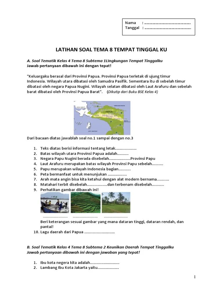 Soal ulangan harian kelas 4 tema 8 subtema 1 lingkungan tempat tinggalku terdiri dari soal pilihan ganda, soal jawaban singkat dan soal . Soal ukk kls 4 smester 2 th 2017 tema 9 sdn gununganyar 273 revisi. Indonesia kelas 4 tema tema 8 subtema 2 keunikan daerah tempat tinggalku. Soal baik essay, isian, uraian, juga pilihan ganda dan kunci jawabannya, berikut ulasan meteri latihan tematik kelas 4 tema 8 daerah tempat tinggalku . Soal kelas 4 tema 2 by airazzahrap.